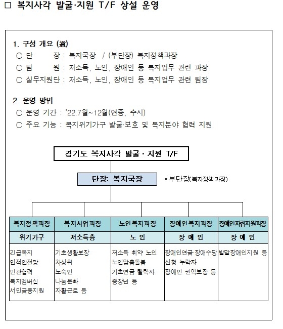 복지사각 발굴‧지원 합동협의체(TF)는 경기도 복지국장을 단장으로 복지정책과, 복지사업과, 노인복지과, 장애인복지과, 장애인자립지원과 등 5개 과로 구성됐다.