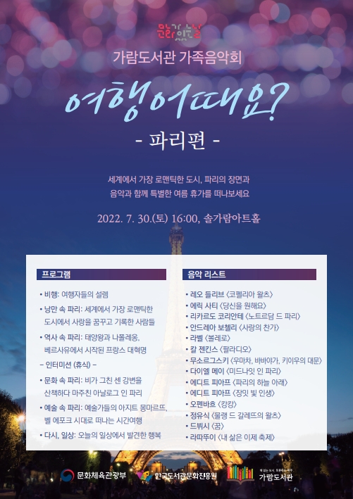 이번 공연에서는 지난해에 열린 ‘여행 어때요? 이탈리아 편’에 이어 파리의 문화와 예술, 역사를 영상과 ASMR, 클래식 연주를 통해 만날 수 있다. 가람도서관은 이번 공연을 통해 시민들에게 색다른 여름휴가 선물을 선사할 것으로 기대하고 있다.