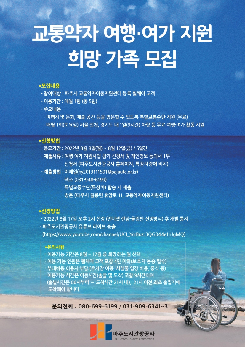 교통약자 여행·여가 지원사업 신청은 8월 8일부터 12일까지 파주시 교통약자이동지원센터에서 접수할 예정이며, 결과는 추첨을 통해 공개한다. 신청 방법 및 기타 자세한 사항은 공사 홈페이지 또는 교통약자 이동지원센터(☎080-699-6199)에서 확인 가능하다.