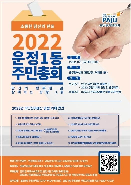 사전투표는 만 16세 이상 운정1동 주민, 사업장 종사자, 학교, 기관 단체에 속한 사람은 누구나 참여할 수 있으며, 투표는 운정1동 행정복지센터와 지역 내 5개 상가 투표소에서 진행되며, 많은 주민들이 참여할 수 있도록 운정1동 주민자치회 카페(cafe.naver.com/unjeong1)와 포스터 등의 QR코드를 통해서도 투표할 수 있다.