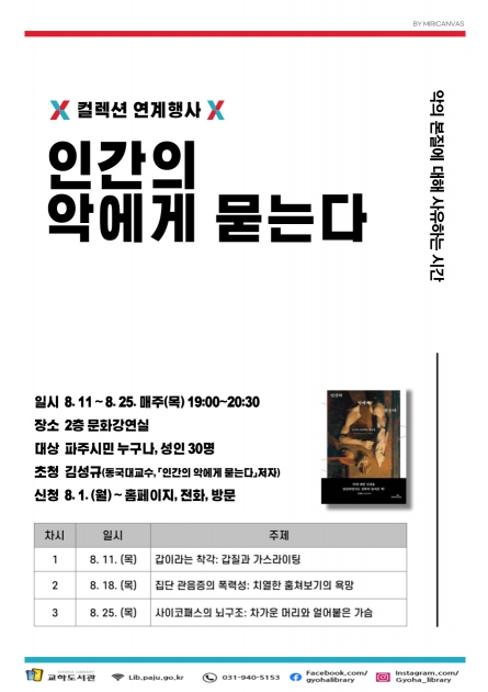 파주시 교하도서관(관장 이현주)은 오는 8월 11일부터 25일까지 매주 목요일 교하도서관 2층 문화강연실에서 ‘인간의 악에게 묻는다’의 저자 김성규 작가를 초청해 인문학 강연을 운영한다고 밝혔다.