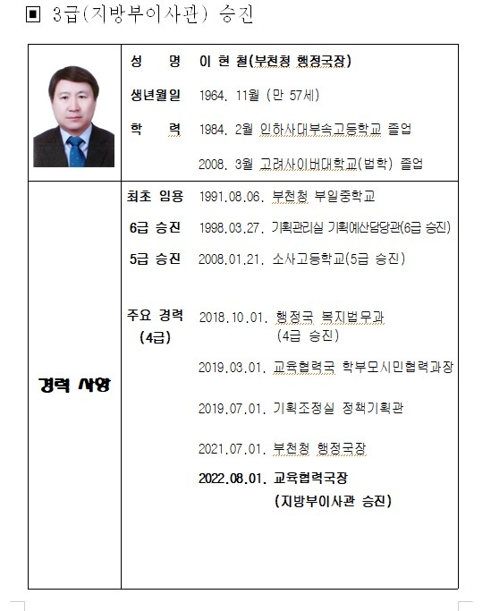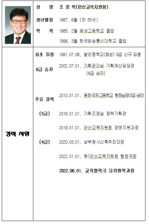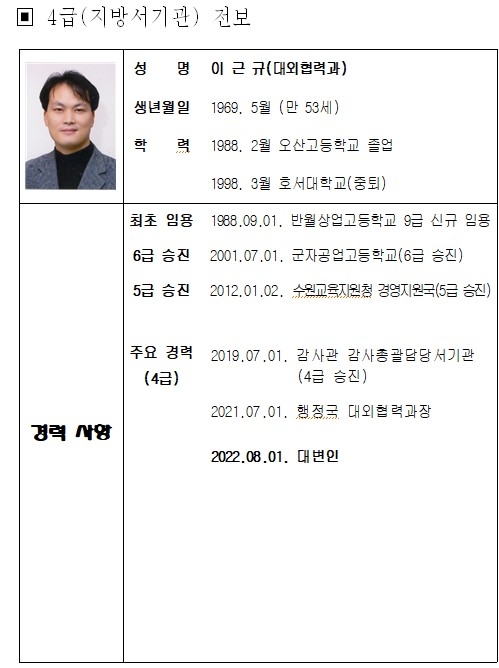 경기도교육청 2022. 8. 1.자 3급,4급 승진 및 전보자 프로필정치ㆍ행정ㆍ파주시ㆍ파주시의회 | 작성일: 2022-07-29 02:17:46 | 수정일: 0000-00-00 00:00:00 경기도교육청 2022. 8. 1.자 3급,4급 승진 및 전보자 프로필