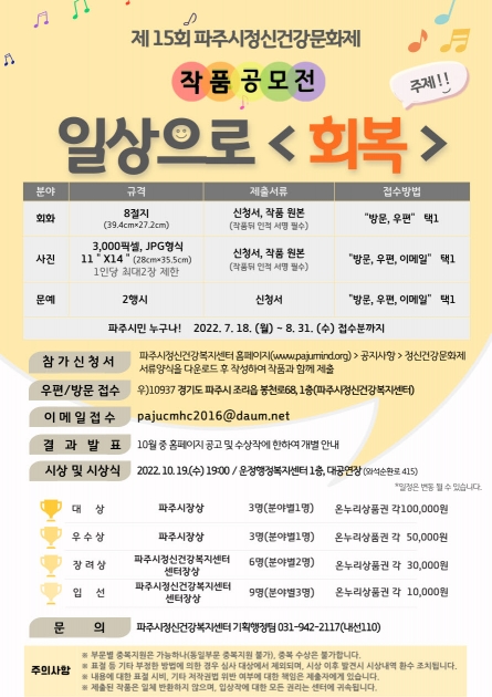신청은 오는 31일까지 신청서와 작품 원본을 센터 이메일(pajucmhc2016@daum.net), 방문, 우편으로 접수하면 되고, 신청서는 홈페이지(pajumind.org)에서 내려받으면 된다.