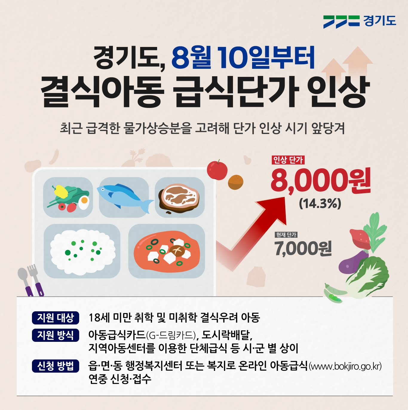 급격히 오르는 물가에 맞춰 급식 지원단가를 높여야 한다는 지적이 사회 곳곳에서 제기되는 가운데 경기도가 8월 10일부터 결식아동 급식단가를 1식 7천 원에서 8천 원으로 14.3% 인상한다.