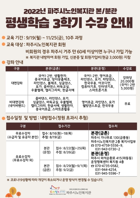 비대면 강좌는 정원 제한이 없으며, 대면 강좌는 각 강좌별 수강생이 상이하므로 자세한 사항은 파주시노인복지관 홈페이지(www.pajusenior.or.kr)에서 확인하거나 파주시노인복지관 담당자(☎031-943-0730~2)에게 문의하면 된다.