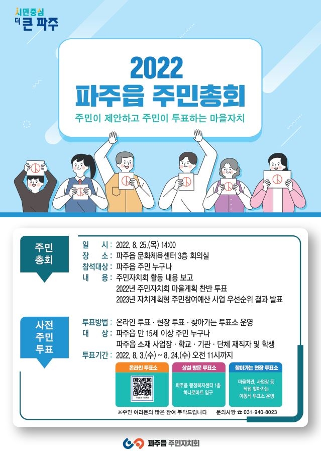 주민총회는 파주읍 주민 누구나 참여 가능하며, 올 하반기 마을계획에 대한 찬반 투표와 함께 2023년 자치계획형 주민참여예산 사업 우선순위를 결정하게 된다.
