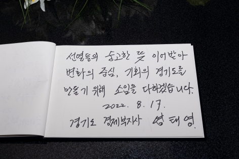 한편, 이날 염 부지사는 현충탑 방명록에 “선열들의 숭고한 뜻 이어받아 변화의 중심, 기회의 경기도를 만들기 위해 소임을 다하겠습니다”라고 적으며 경기도의 더 나은 미래와 도민들과 함께 혁신성장을 이뤄내겠다는 의지를 거듭 다지기도 했다.