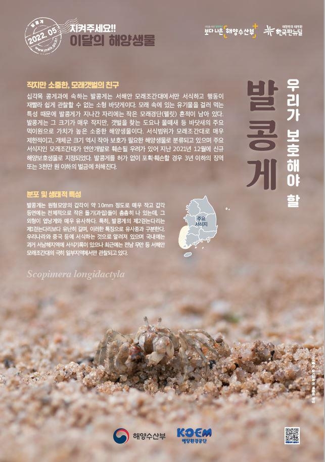 ○ **발콩게는 ’21년 12월 해양보호생물, ’22년 5월의 해양생물로 지정 기후변화 및 연안개발 등으로 인하여 개체수와 서식지가 현저하게 감소
