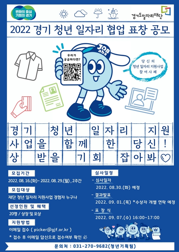 포상과 관련 자세한 사항은 경기도일자리재단 누리집(www.gjf.or.kr)을 참고하거나 청년기획팀(031-270-9682)으로 유선 문의도 가능하다.