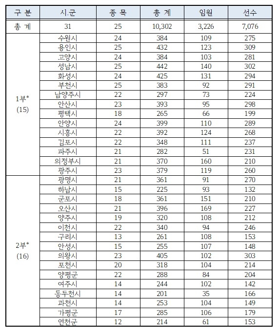 이번 대회에는 도내 31개 시군 1만302명(선수 7천76명, 임원 3천226명)의 선수단이 참가해 1부와 2부로 나눠 육상, 수영, 축구 등 25개 종목에서 실력을 겨루게 된다.