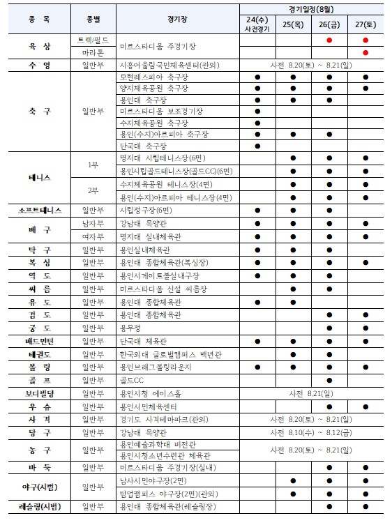 종목별 경기일정 및 장소