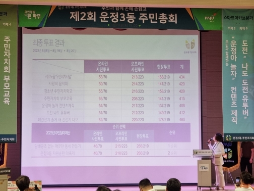 또한 2023년 자치계획형 주민참여예산안으로는 1순위는 ▲담배꽁초 없는 깨끗한 동네 만들기, 2순위는 ▲운정3동 자원순환 대축제로 총 2건이 찬성 90%로 의결됐다.