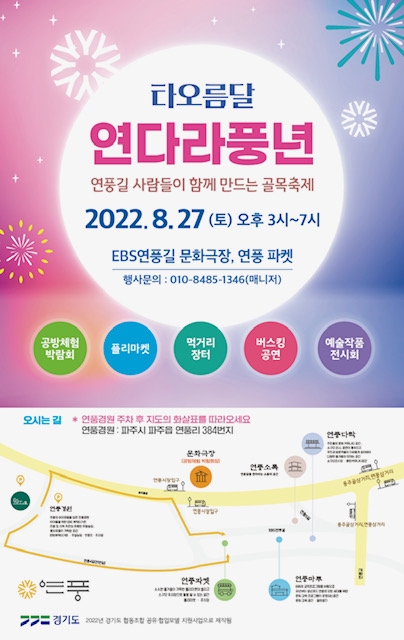 플리마켓, 먹거리장터, 버스킹 공연 등이 함께 진행되며, 지난달 연다라풍년 행사 ‘파주 작가 다 모여라~’를 통해 전시됐던 작품들도 관람할 수 있다.