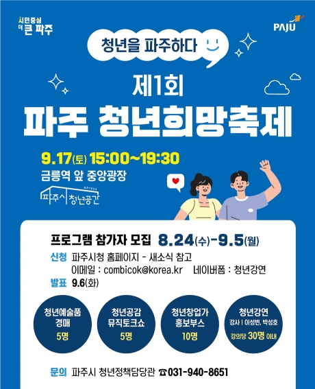 파주시(시장 김경일)는 오는 9월 17일 금릉역 앞 중앙광장에서 제1회 파주 청년희망축제를 개최한다.