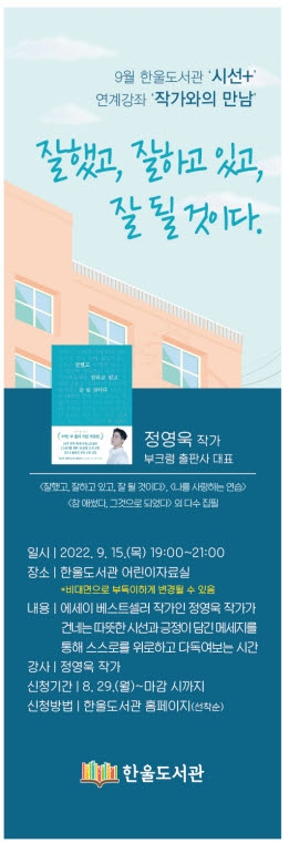 파주시 한울도서관은 오는 9월 15일 ‘시선+’ 북컬렉션 연계 강좌로, 정영욱 작가와의 만남 ‘잘했고, 잘하고 있고, 잘 될 것이다’를 진행한다.