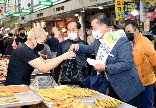 또 시장을 찾은 시민들에게는 전통시장을 더 많이 찾아줄 것을 당부했다. 김 시장은 온누리상품권으로 직접 떡, 생선, 과일 등 명절 성수품을 구입하면서 장바구니 물가를 확인하기도 했다.
