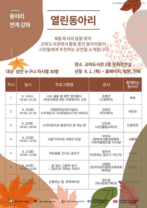 자세한 사항은 교하도서관 홈페이지에서 확인해 볼 수 있으며, 9.1(목)부터 홈페이지, 전화, 방문을 통해 접수를 받고 있다.