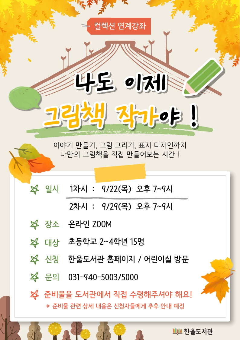 이와 연계한 독서 프로그램 ‘나도 이제 그림책 작가야!’ 강좌가 오는 22일과 29일에 운영되는데, 초등학교 2~4학년 학생 15명을 모집해 오후 7시부터 9시까지 ZOOM을 통해 비대면으로 진행될 예정이다.