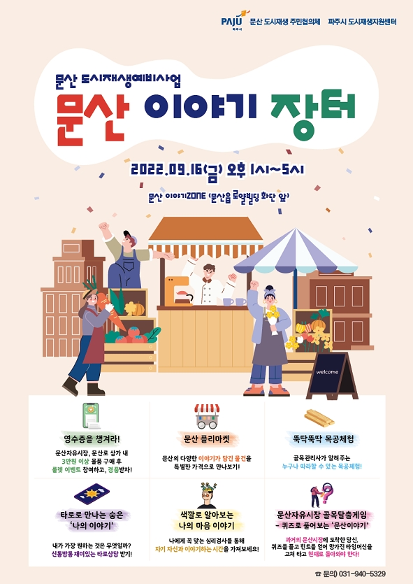 파주시 도시재생지원센터에서 진행하는 이번 행사는 2022년 문산읍 도시재생예비사업의 일환으로 조성된 ‘문산 이야기 ZONE’에서 개최되며, 문산자유시장 일원의 상권 활성화를 위해 문산자유시장 상인회와 인근 상가인 로얄빌딩 운영위원회뿐 아니라 주민협의체 등 지역 주민들이 함께 협력해 준비한 행사다.