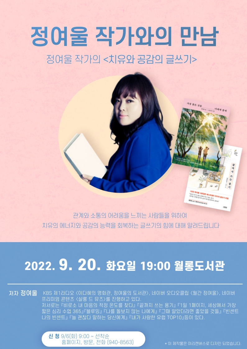 이번 작가와의 만남은 9월 독서의 달을 맞아 ‘치유와 공감의 글쓰기’라는 주제로 마련됐으며, 일상생활과 여행에서 배운 삶의 지혜를 공유하고, 관계와 소통의 어려움을 겪는 이들에게 상처를 치유하는 글쓰기의 힘에 관한 이야기를 나눌 예정이다.