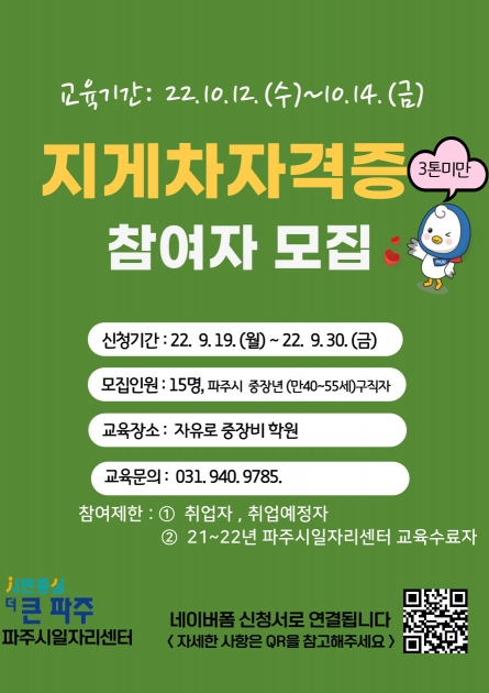 이번 교육은 파주시에 주민등록을 둔 만 40세~55세까지의 취업희망자(실업자)로, 자동차 운전면허 1종 보통 이상 소지자라면 누구나 신청이 가능하다.