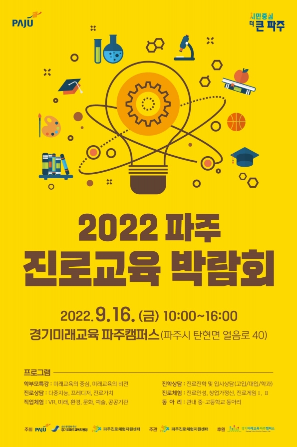파주시(시장 김경일)는 3년 만에 대면행사로 개최된 ‘2022 파주진로교육박람회’가 16일 경기미래교육 파주캠퍼스에서 성황리에 개최됐다고 밝혔다.