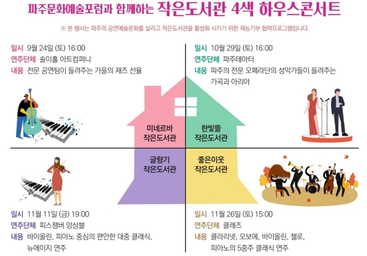 파주시(시장 김경일)는 관내 작은도서관 4개소에서 오는 24일부터 11월까지 클래식과 재즈 공연을 하우스콘서트 형식으로 개최한다고 밝혔다.