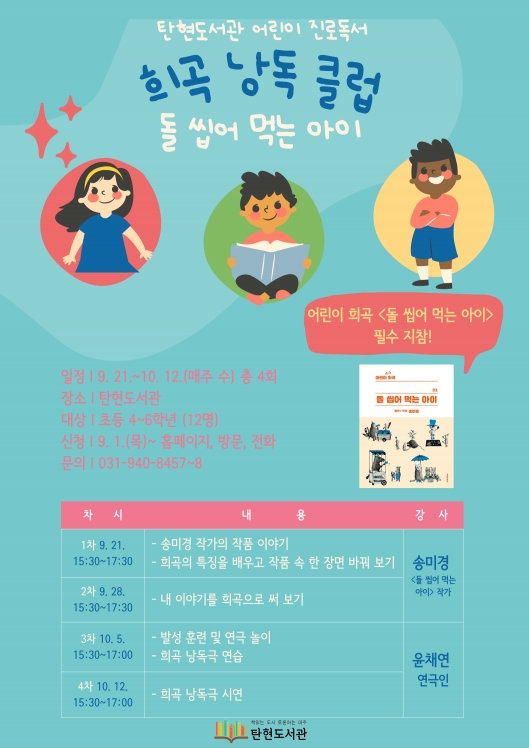 파주시 탄현도서관은 오는 21일부터 10월 12일까지 매주 수요일에 어린이 진로독서 프로그램인 ‘희곡 낭독 클럽: 돌 씹어 먹는 아이’를 운영한다.