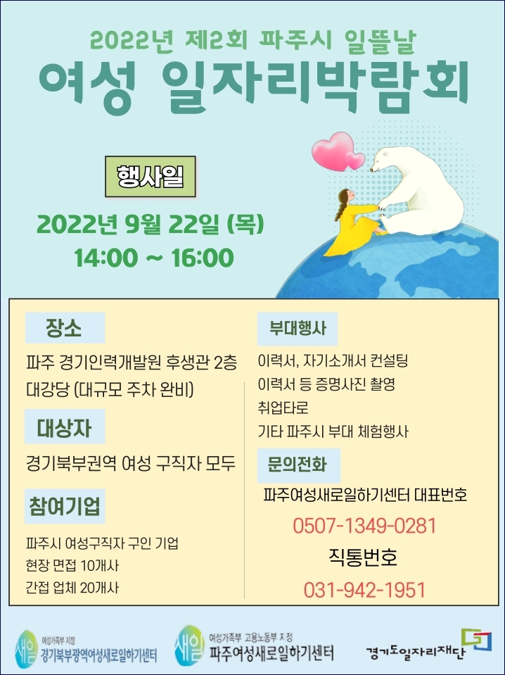 파주시(시장 김경일)는 경기도일자리재단에서 파주여성새로일하기센터와 오는 22일 파주 경기인력개발원에서 하반기 여성취업박람회 ‘일뜰날’을 개최한다고 밝혔다.