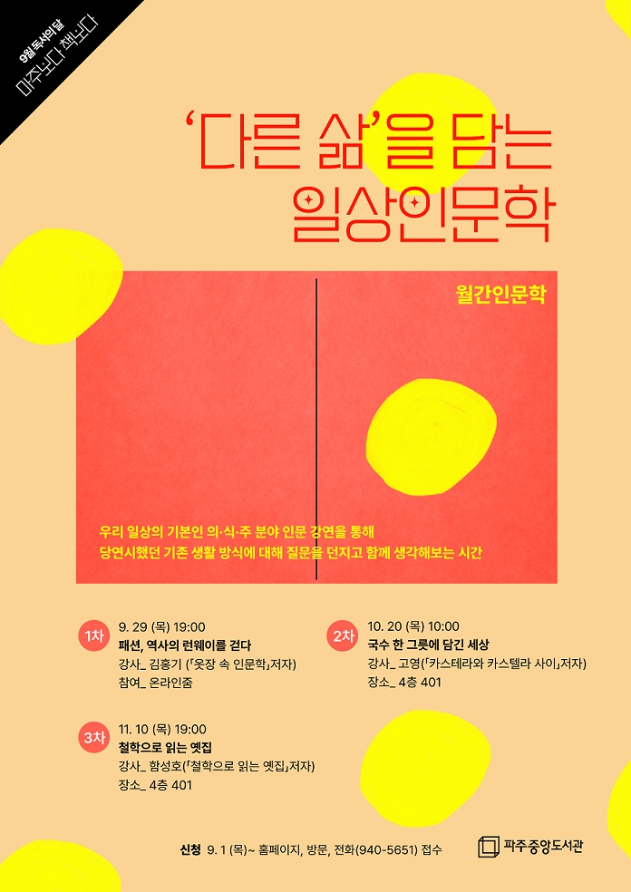 파주중앙도서관(관장 권예자)은 오는 11월까지 매달 ‘일상인문학’이라는 주제로 의·식·주 분야의 인문 강연을 개최한다.