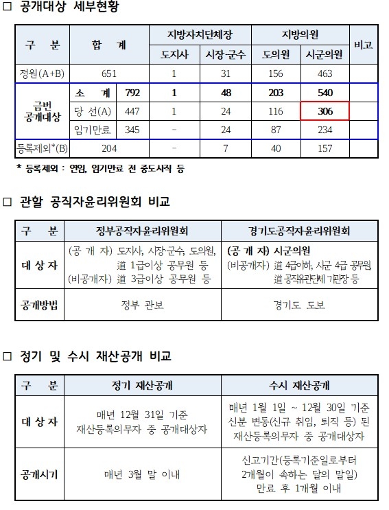 경기도공직자윤리위, 30일 민선 8기 시·군 신규 선출직 공직자 306명 재산공개