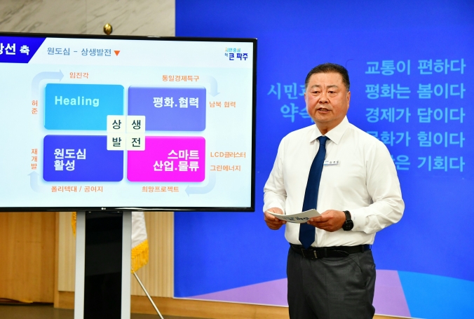 김 시장은 이어 교통, 평화, 경제, 문화, 관광, 복지, 청년, 교육, 농촌, 행정 등 10대 분야에 대한 시정방향과 주요사업을 제시했다.