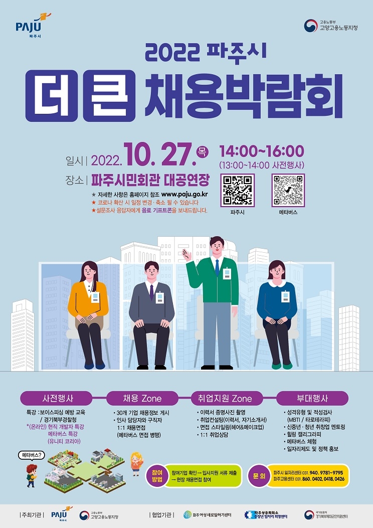 파주시(시장 김경일)는 오는 27일 오후 2시(식전행사 1시)부터 파주시민회관 대공연장에서 ‘2022 파주시 더 큰 채용박람회’를 개최한다.