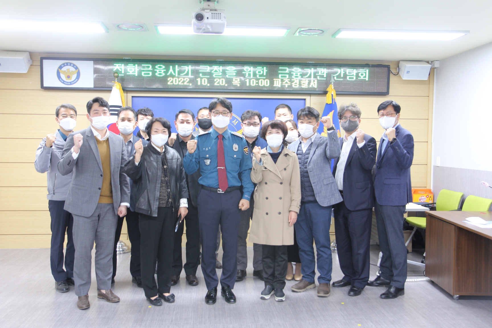 파주경찰서(서장 이재성)는 10월 20일(목) 오전10시 파주경찰서에서 시청 담당 부서 및 파주시 관내 금융기관(파주우체국, 신한은행, 우리은행, 기업은행, 신교하농협, 파주연천축협)과 함께 전화금융사기(보이스피싱) 범죄에 대응하기 위한 간담회를 개최하였다.