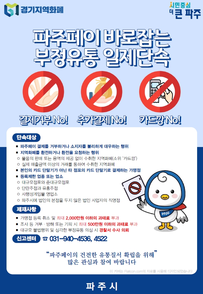 파주시, 지역화폐(파주페이) 부정유통 일제단속 실시 - 10월 31일부터 11월 18일까지