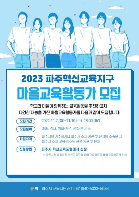 파주시(시장 김경일)는 혁신교육지구 사업의 일환으로 ‘2023년 파주혁신교육지구 마을교육활동가’를 오는 16일까지 모집한다.