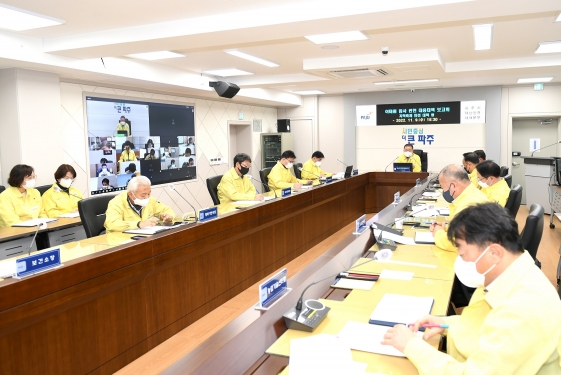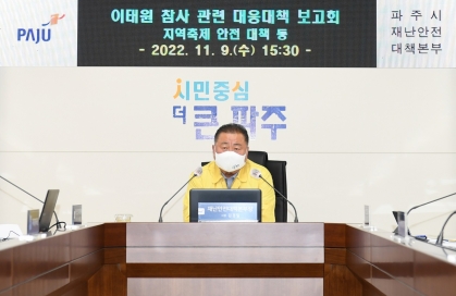 파주시(시장 김경일)는 11월 9일 ‘이태원 참사 대응 추진사항 및 분야별 대응대책 보고회' 를 개최하고, 불특정 다수가 운집하는 행사·축제에 대한 안전관리계획 수립과 분야별 안전점검 강화 방안을 마련했다.