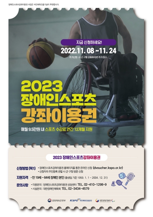 장애인 스포츠강좌이용권은 오는 24일까지 모집하며, 모집 대상은 만 19세~64세(출생일 1959.1.1.~2004.12.31.)으로, 2022년부터 기존 만 12세~49세 저소득층 장애인에서 만 19세~64세 장애인으로 지원 대상을 확대했다.