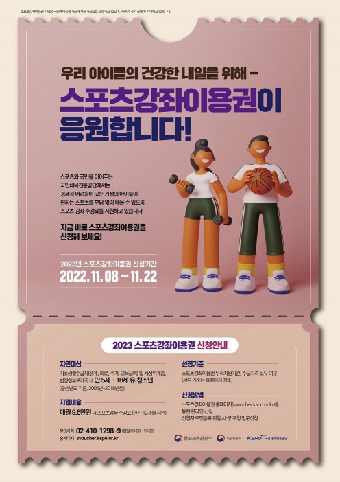 스포츠강좌이용권 지원사업은 체육활동을 하고 싶지만 경제적으로 참여가 어려운 취약계층 유·청소년과 장애인을 대상으로, 1인당 매월 9만5,000원 범위 내에서 지정된 가맹시설 스포츠강좌의 수강료를 지원하는 사업이다.