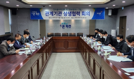 파주시(시장 김경일)는 18일 영상회의실에서 한국폴리텍대학(이하 폴리텍대) 경기북부캠퍼스 건립사업에 대해 관계기관들과 협력회의를 개최했다.