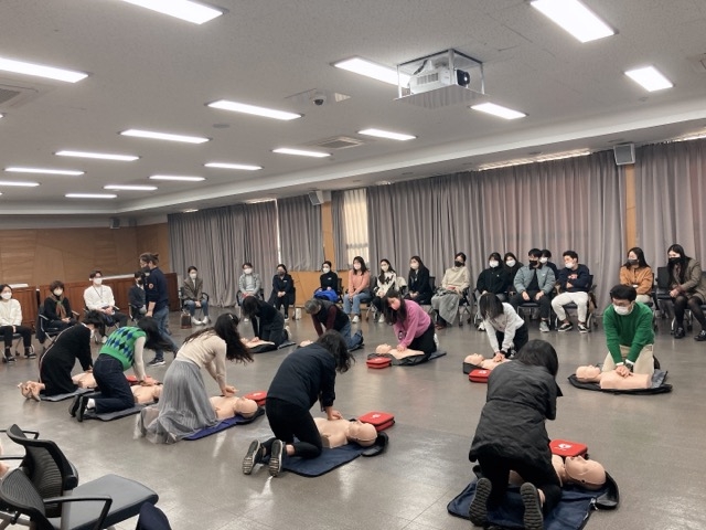 이론교육은 ▲심폐소생술과 AED(자동심장충격기) 사용법 습득 ▲응급처치 시 법적인 관점 이해 등으로 진행됐으며, 실습은 마네킹을 이용한 ‘30번 가슴압박’ 등을 2시간가량 진행했으며, 효과적인 실습을 위해 회차당 30명으로 인원을 제한했다.