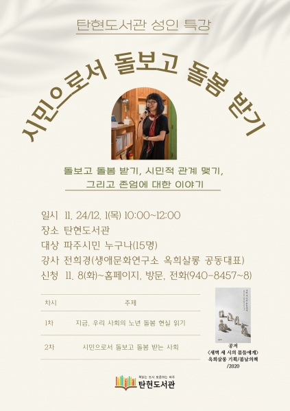 파주시 탄현도서관은 오는 24일과 12월 1일 2회에 걸쳐 성인특강 「시민으로서 돌보고 돌봄 받기」를 운영한다.