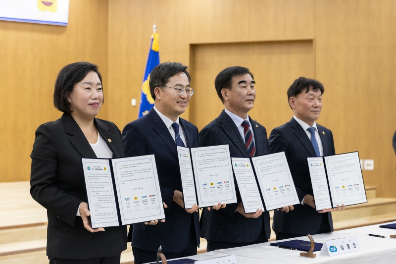 김동연 경기도지사와 염종현 경기도의회 의장, 더불어민주당 남종섭 대표의원, 국민의힘 곽미숙 대표의원은 25일 경기도의회 대회의실에서 이런 내용을 담은 ‘경기도-경기도의회 여·야·정 협의체 공동협약서’에 공동 서명하며 본격적인 ‘김동연표’ 정책협치, 민생협치의 출발을 알렸다.