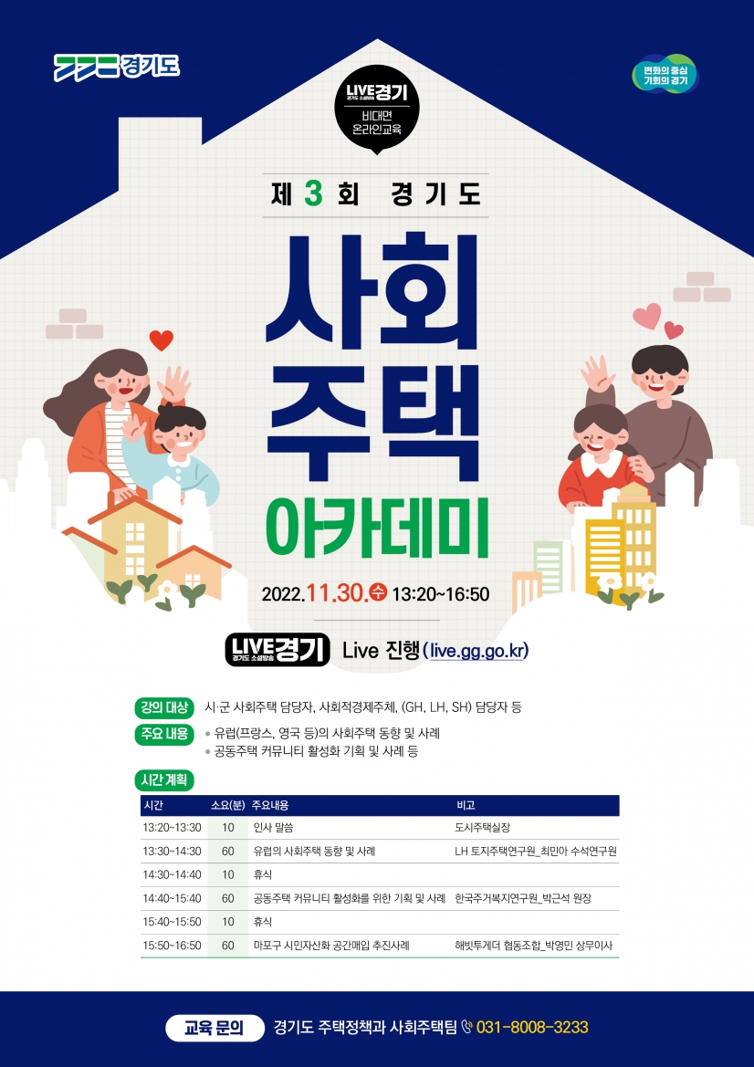 경기도는 11월 30일 사회적 경제주체의 공유자산 추진사례 및 공동주택 커뮤니티 활성화 사례 등을 교육하기 위한 ‘제3회 사회주택 아카데미’를 온라인 비대면으로 개최한다.