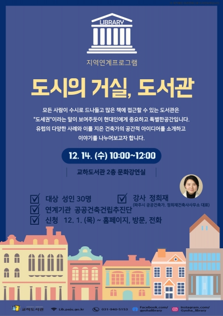 오는 14일에는 파주시 공공건축건립추진단 자문위원인 정희재 건축사와 ‘도시의 거실, 도서관’을 주제로 한 대중 강연이, 23일에는 교하책향기마을13단지에 소재한 다함께돌봄센터와 함께하는 ‘토리아저씨 크리스마스 매직쇼’ 공연이 준비돼 있다.