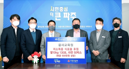 파주시(시장 김경일)는 8일 감사교육원(원장 조성은)에서 파주시 취약계층을 위해 현금 500만원 상당의 쌀 1,300kg과 라면 50박스를 전달받았다고 밝혔다.
