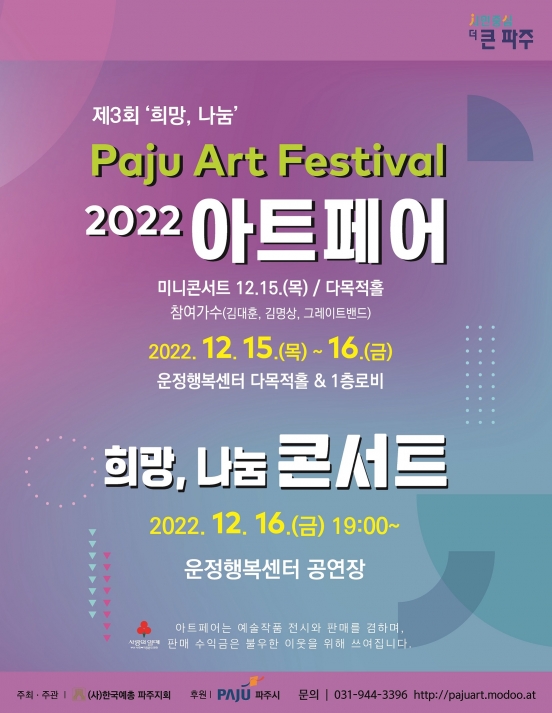 2022 제3회 ’희망, 나눔‘ Paju Art Festival 행사가 오는 15~16일 운정행복센터에서 개최된다.