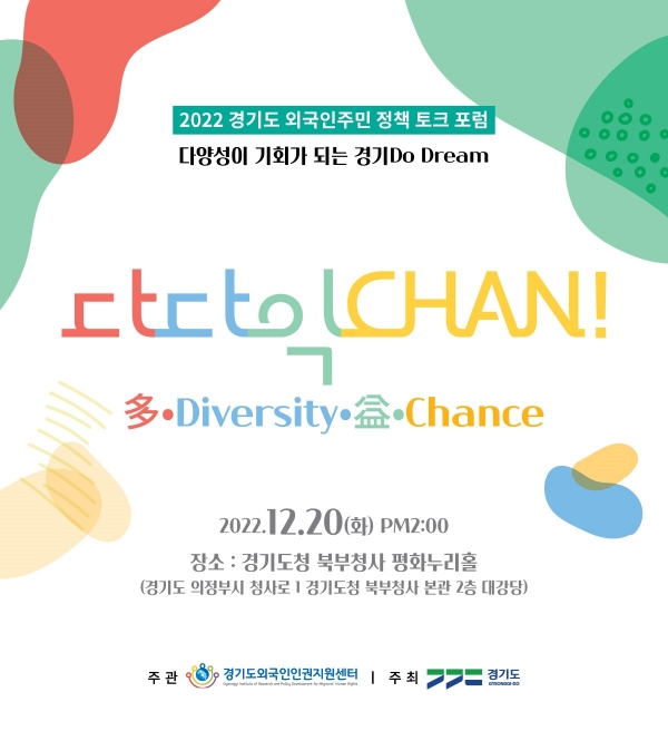 경기도 외국인 인권지원센터는 ‘다양성이 기회가 되는 경기도’를 주제로 ‘2022 경기도 외국인주민 정책 토크 포럼–다다익찬(多․Diversity․益․Chance)’을 오는 20일 오후 2시 경기도청 북부청사 평화누리홀에서 개최한다고 13일 밝혔다.