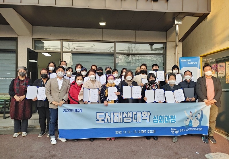 파주시(시장 김경일)는 지난 10일 파주시 도시재생지원센터에서 ‘2022 파주시 도시재생대학 심화과정’의 수료식을 갖고 교육생 22명에게 수료증을 수여했다.