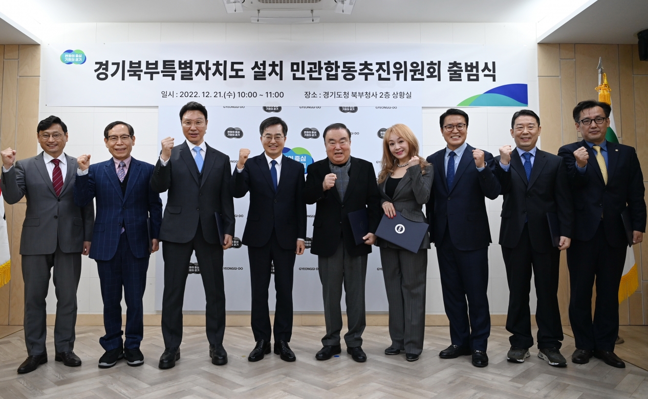 김동연 경기도지사는 21일 경기도청 북부청사에서 ‘경기북부특별자치도 설치 민관합동추진위원회 출범식’을 열고 문희상 전 국회의장과 강성종 신한대학교 총장 등 10명에게 위촉장을 수여했다.